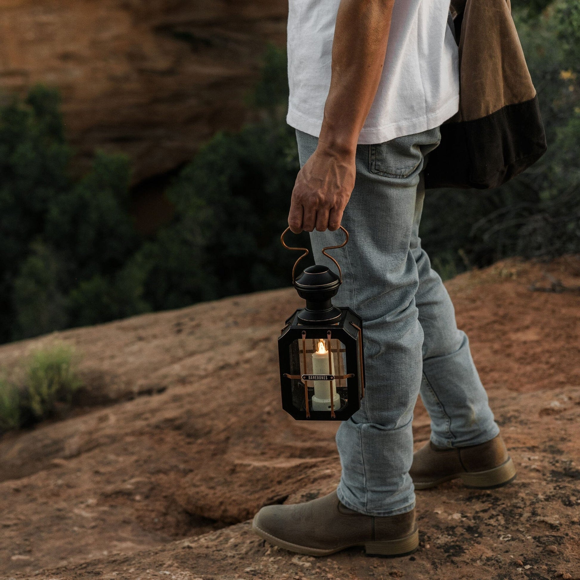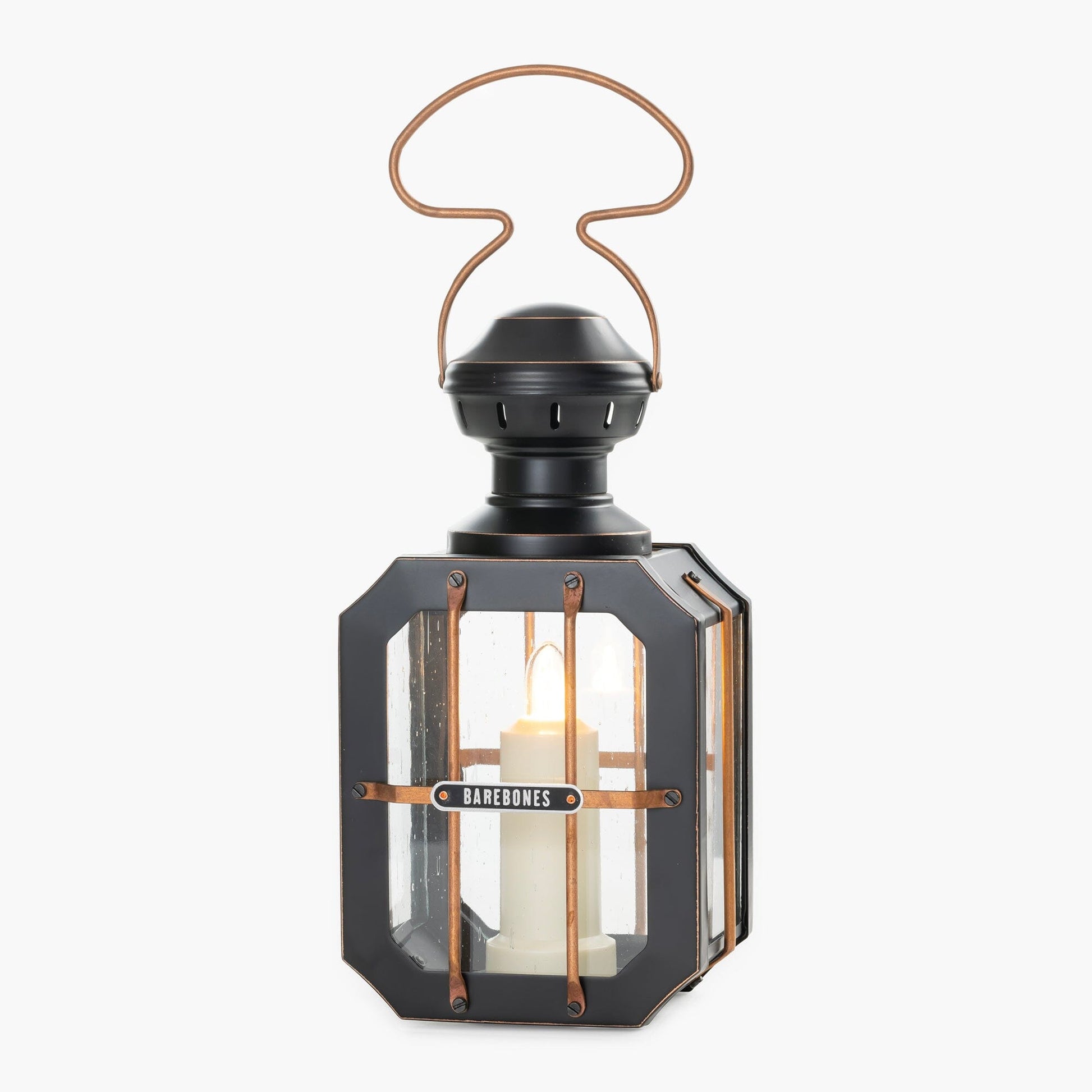 The vintage-inspired Box Candle Lantern is crafted from durable steel and glass with a blackened bronze finish and copper-colored cage details. Replaceable seeded glass panels create a 360° view of flickering light, while dual magnetic doors make candle changes simple. A built-in platform catches wax run-off for clean, worry-free use.