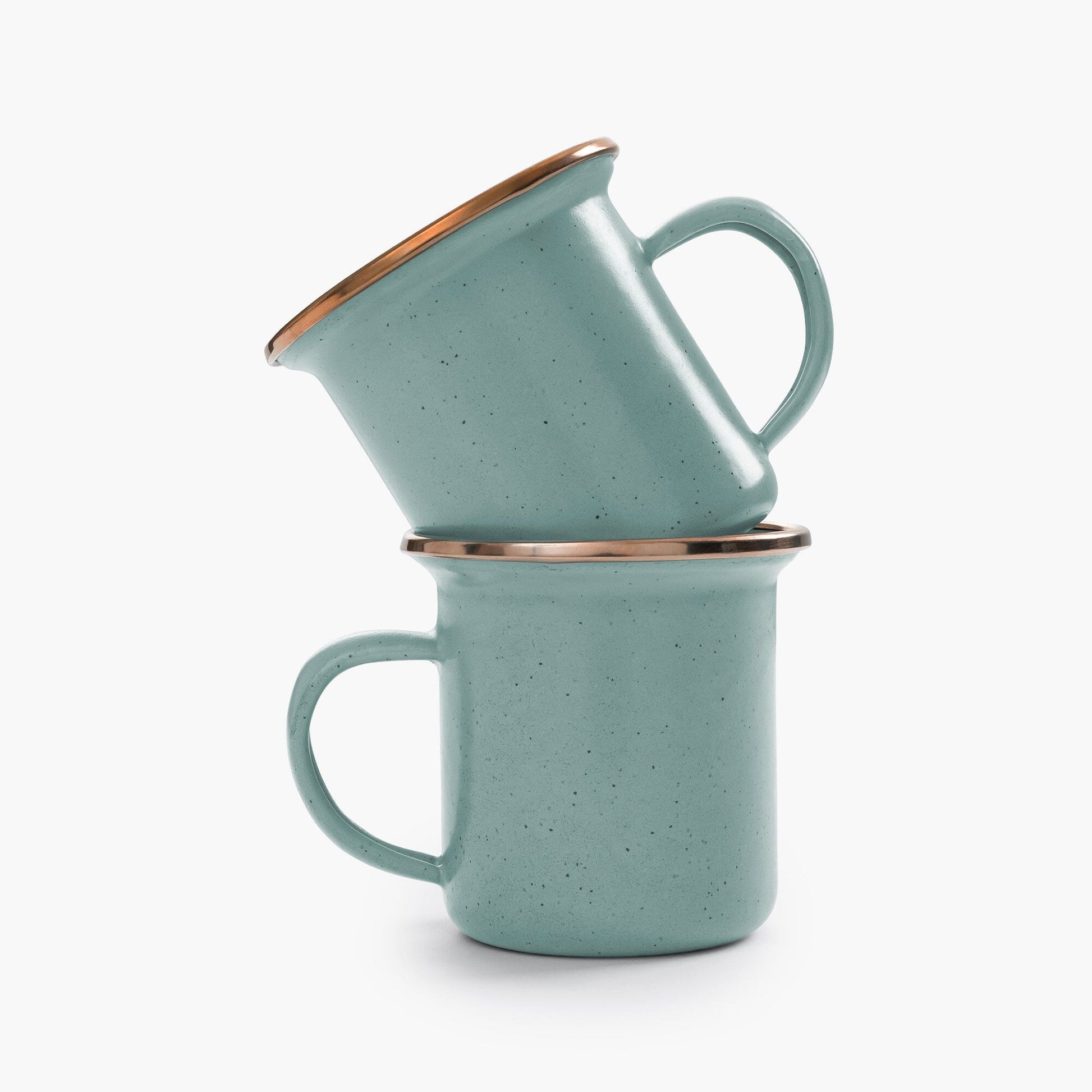 Each enamel espresso cup set features a speckled enameled surface hand-finished baked stainless steel rim creating a bronze-like patina finish, resulting in unique pieces that form a cohesive set.