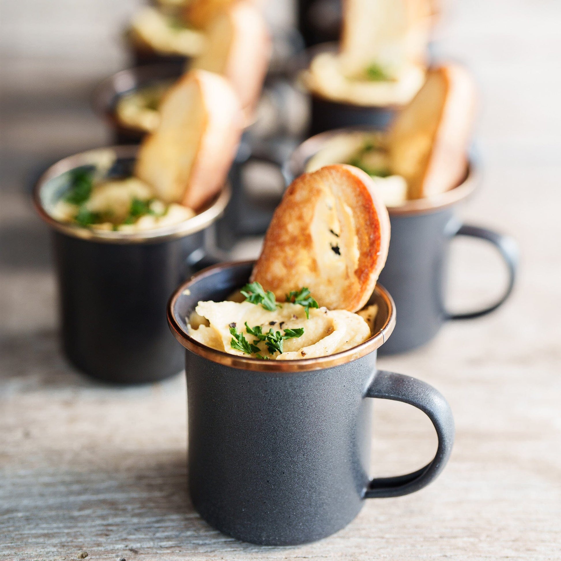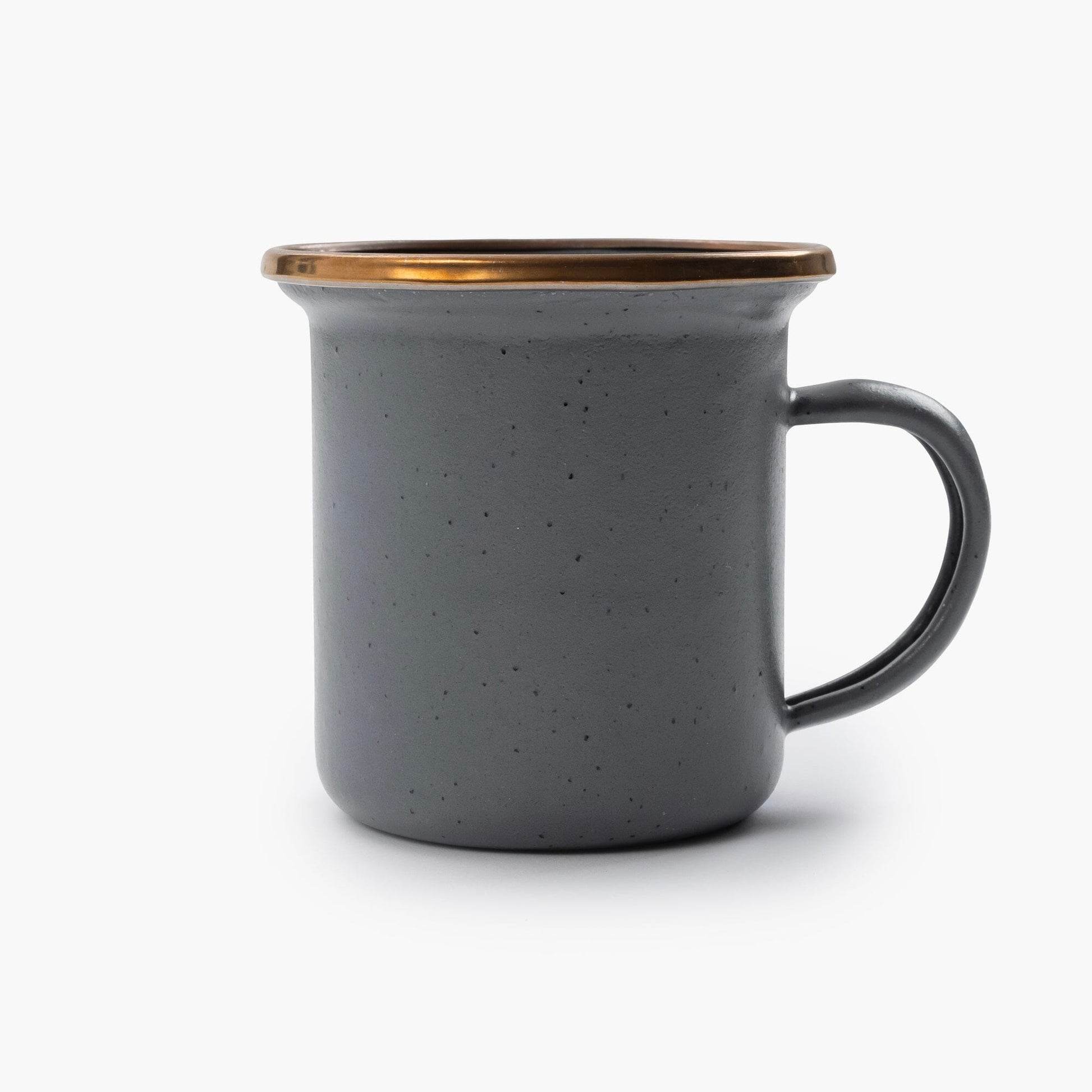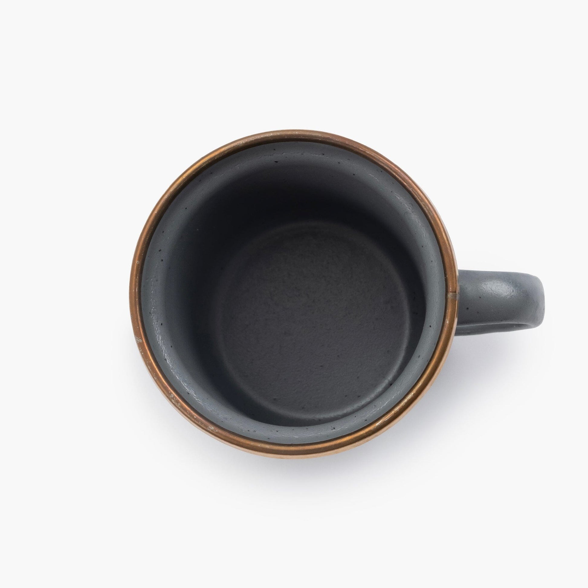 Each enamel espresso cup set features a speckled enameled surface hand-finished baked stainless steel rim creating a bronze-like patina finish, resulting in unique pieces that form a cohesive set.