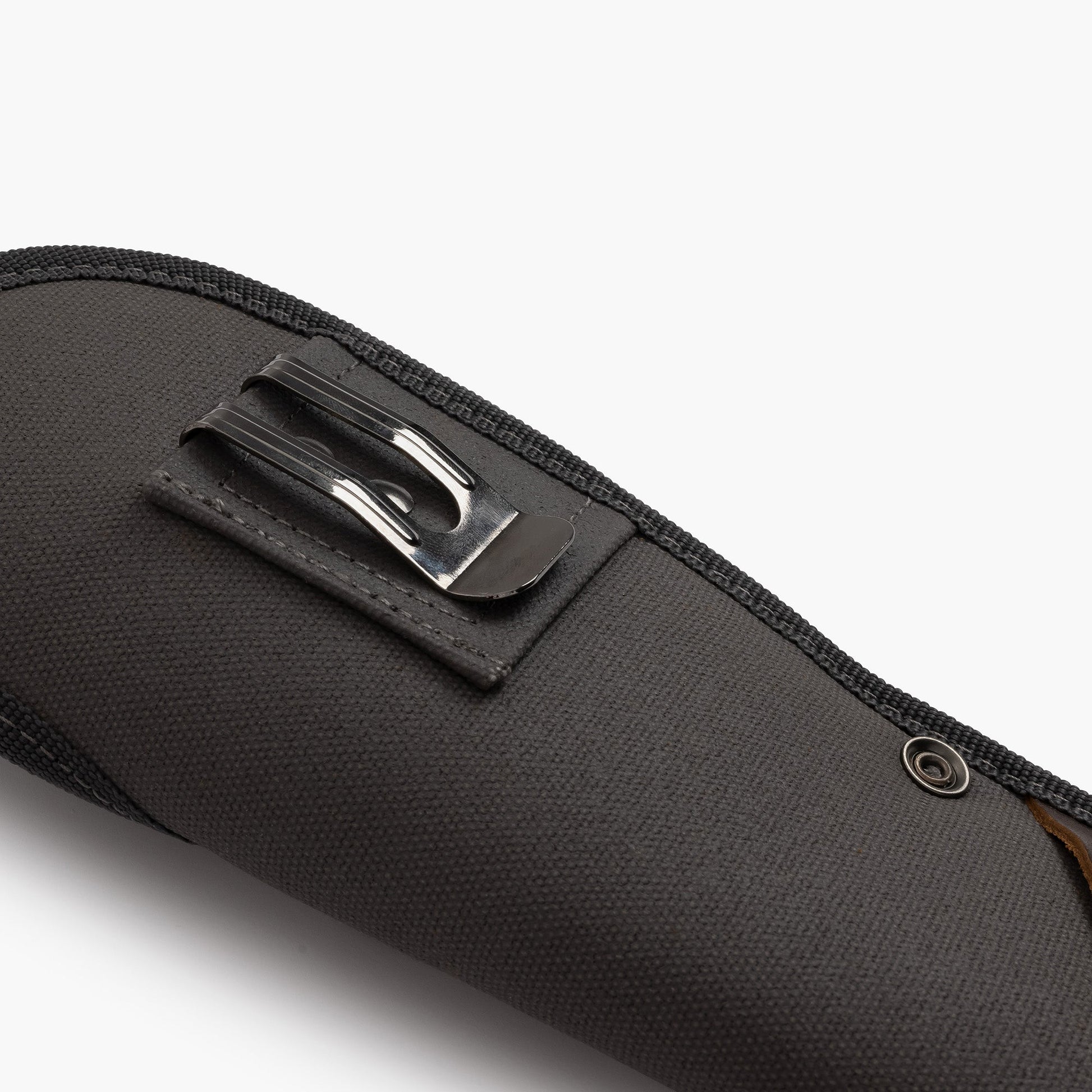 The ultimate shield for the ultimate tool, Nata Sheath unites utility and design. Made of 900D polyester with an interior liner, it weathers real-world use while protecting the blade from dulling. Stainless steel belt clip supports easy carrying and accessibility, while the strong handle strap restricts the blade from slipping or moving. Open-end allows for easy cleaning and prevents soil buildup, preserving the blade for years of continued use. Accented with full-grain leather and copper to complement the rest of our Woodsman Collection.