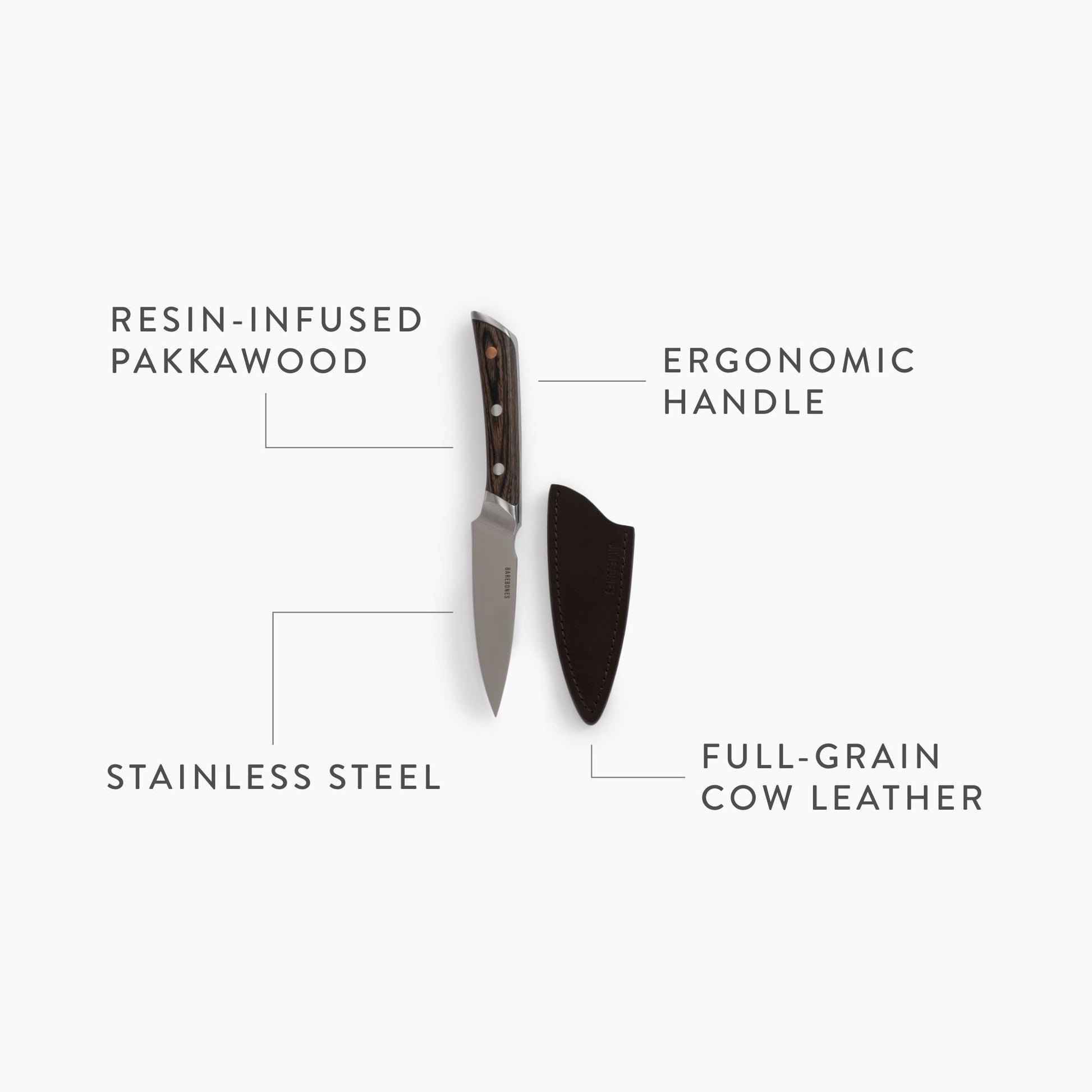 The full-tang, forged stainless steel blade is German-grade, strong, and durable. Blade notches for thumb and finger allow for a professional grip, control, and accuracy when slicing, dicing, and mincing. Pakkawood handle is weighted and balanced; This stabilized composite wood is ideal for culinary purposes as its heat and moisture-resistant. Included sleeve weathers real-world use while protecting the blade from dulling. Leather material will only soften over time to a beautiful, smooth patina.
