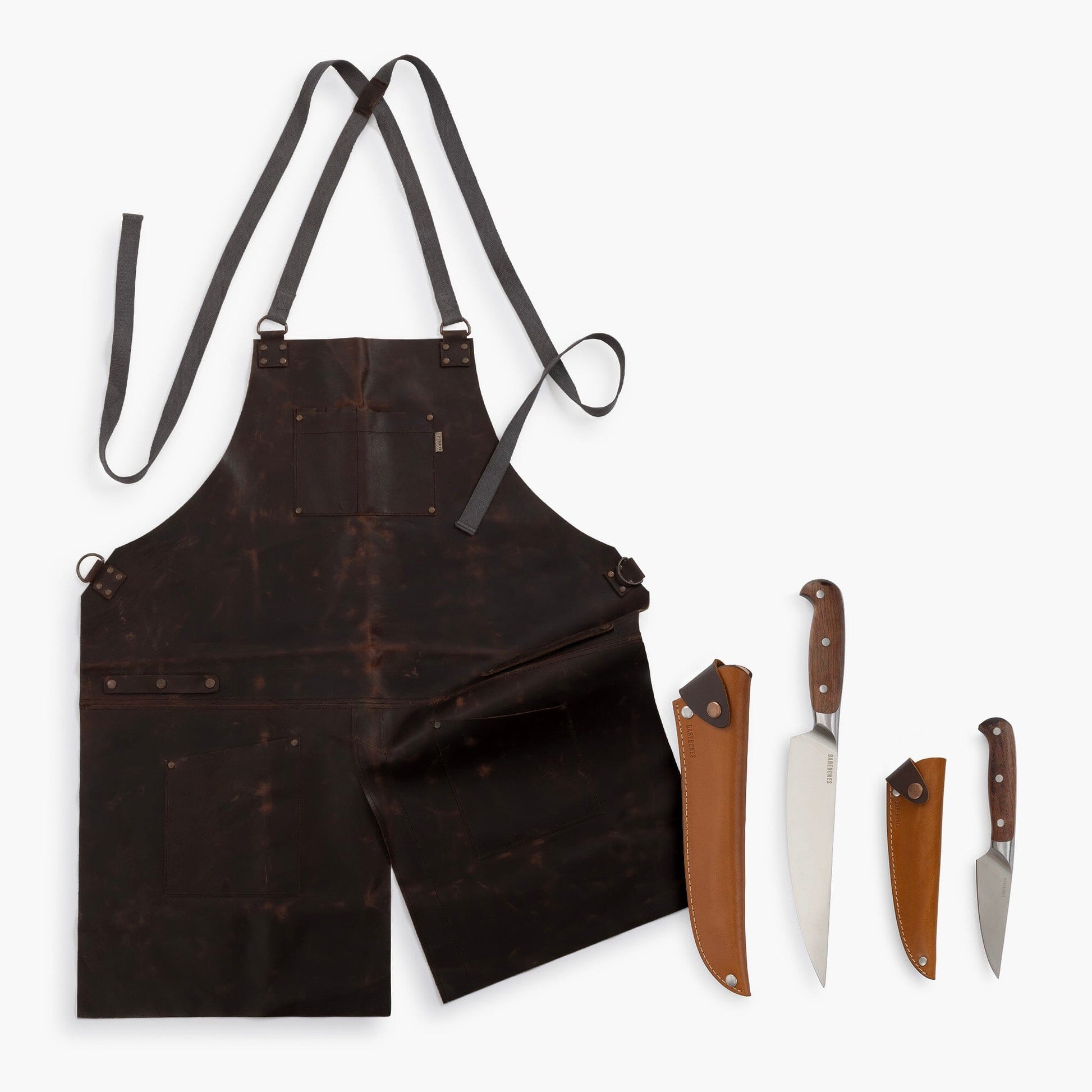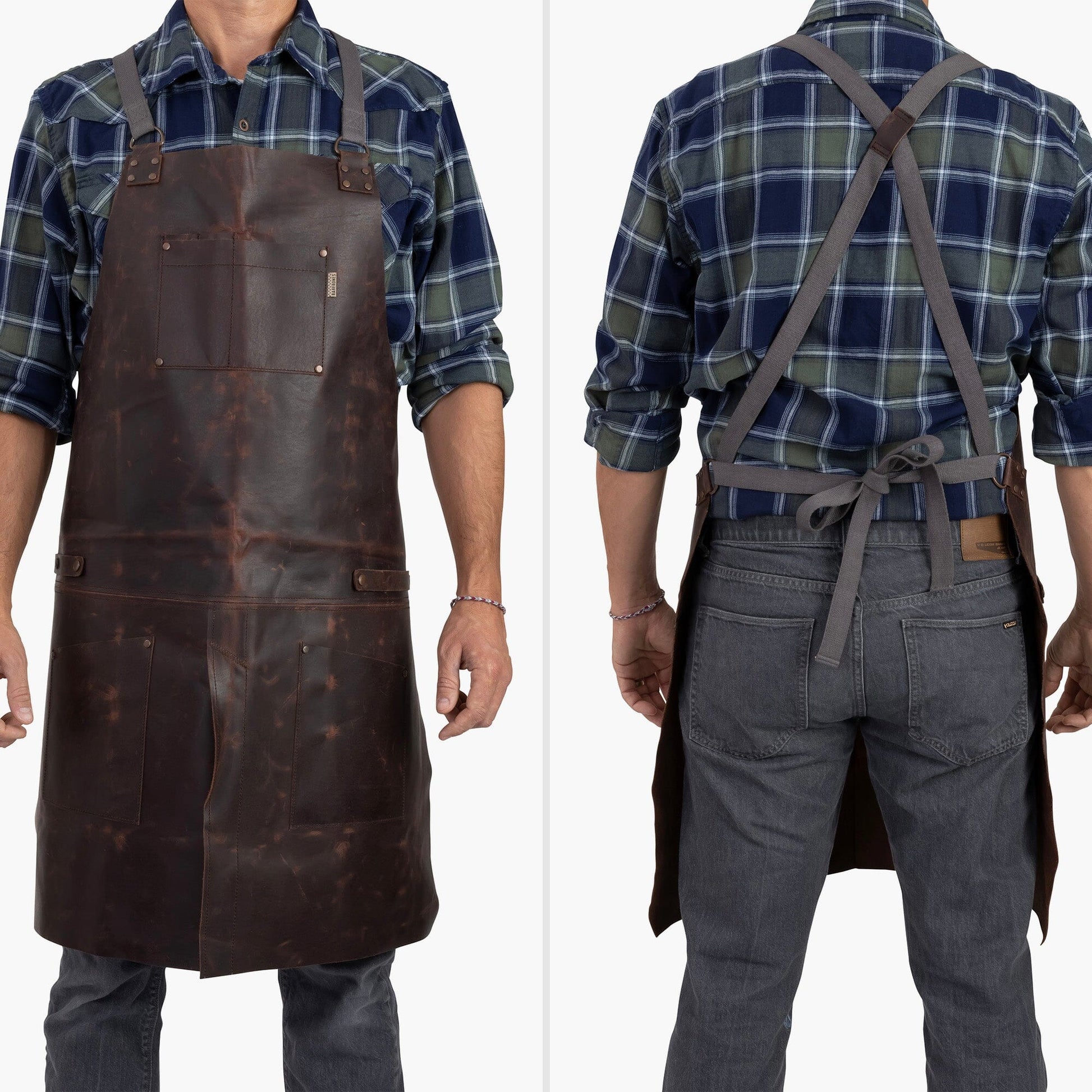 The Premium Chef's Bundle features everything you need for culinary excellence in the kitchen or the great outdoors. Multi-task between cooking, woodworking, welding, or any shop activity with the Tradesman Leather Apron. Handmade by local artisans in Pakistan, this 100% full-grain water buffalo leather apron is built to work, with multiple pockets and straps for holding tools, towel, cell phone, and pens/pencils. Adjustable canvas/cotton cross-straps reduce pressure on the neck, fitting all body types and sizes.
